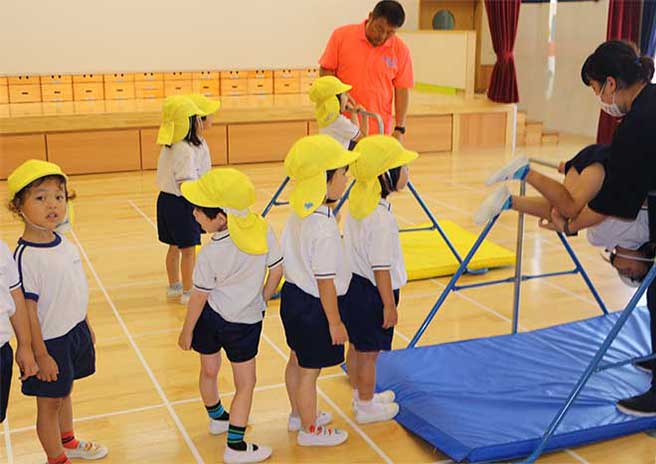 1年間を通して毎週火曜日・木曜日に各クラスごとに、マット運動・跳び箱・ボール(ドッヂボールなど)鉄棒・縄跳びなど体育専門の講師が指導します。